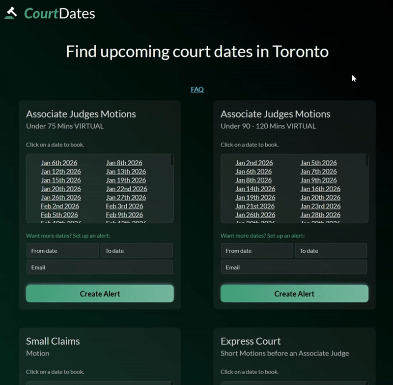 Toronto court delays have been a significant issue. When we launched courtready.ca in June 2025, hearing dates bookable through the Toronto court’s Calendly system were 9 𝘮𝘰𝘯𝘵𝘩𝘴 𝘰𝘶𝘵 on average.