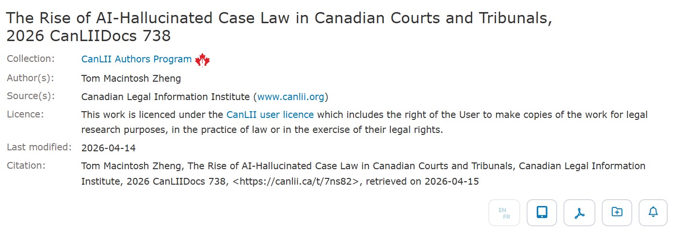 The full study is available on CanLII at 2026 CanLIIDocs 738. The underlying database, updated weekly, is at courtready.ca/fictitious-citations-in-canadian-courts.