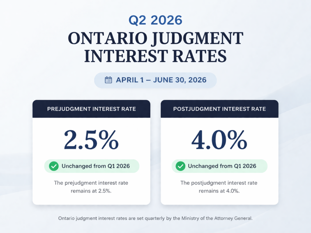 The Ontario Government has confirmed new judgment interest rates effective April 1, 2026, applying to Q2 2026 only (April 1 to June 30, 2026).